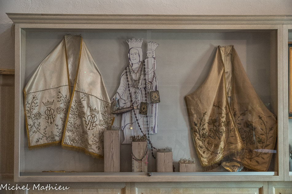 Chapelle Notre-Dame-de-Pitié Le trésor de Notre-Dame occupe la vitrine sud. Il rassemble des dons spontanés en général appendus à la statue. Dès le XVIe siècle, en temps ordinaire comme pour la procession, elle se couvrait de ces couronnes, rosaires, puis poissons et cœurs d'argent au XIXe siècle, parée de divers manteaux selon les fêtes et les époques. Le sceptre d’argent a peut-être remplacé un simple bouquet dans la main droite de la Vierge. Il porte la gravure commémorative de son don par les gardes nationaux de Marignane après 1870.