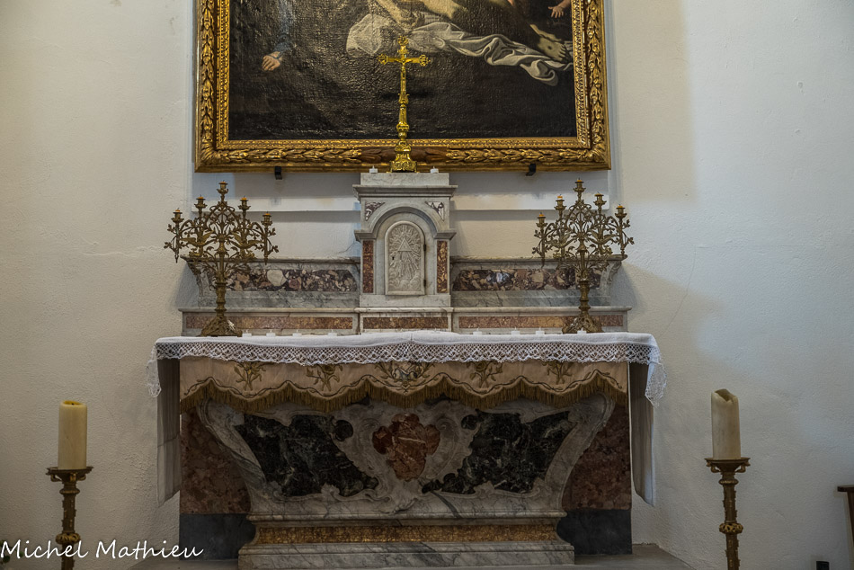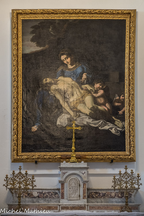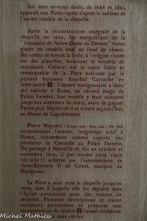 Chapelle Notre-Dame-de-Pitié La Pietà du maître-autel demeure le tableau emblématique du sanctuaire. Il a remplacé en 1656 un panneau peint sur bois probablement au XVIe siècle, longtemps conservé. Copie de l'œuvre d'AnnibaI Carrache (1599-1600) actuellement à Naples, il a vraisemblablement été exécuté au Palais Farnèse par Pierre Mignard qui l'aurait vendu lors de son passage à Marseille et Aix, venant de Rome à l'automne 1656. La toile clouée au centre d’un retable classique en bois doré de style français a été déposée en 1898 dans l'église puis remise en place en 2015. Un tabernacle bleu empiétait sur sa partie basse et coupait le cadre qui en garde trace. Le groupe central du tableau a été copié sur plusieurs ex-voto.