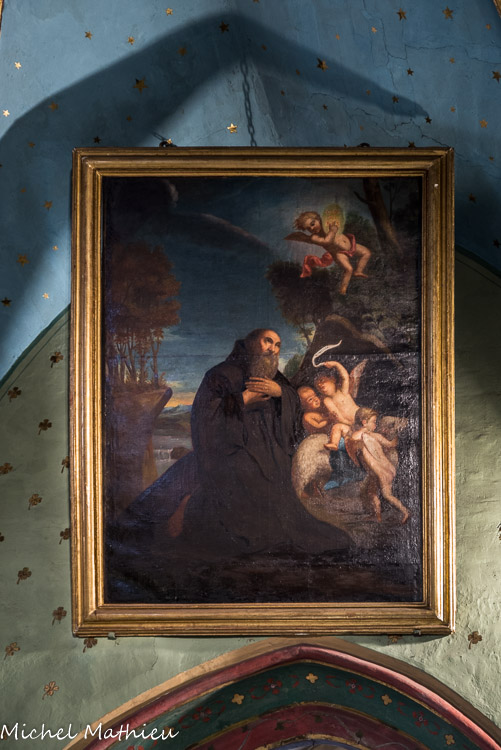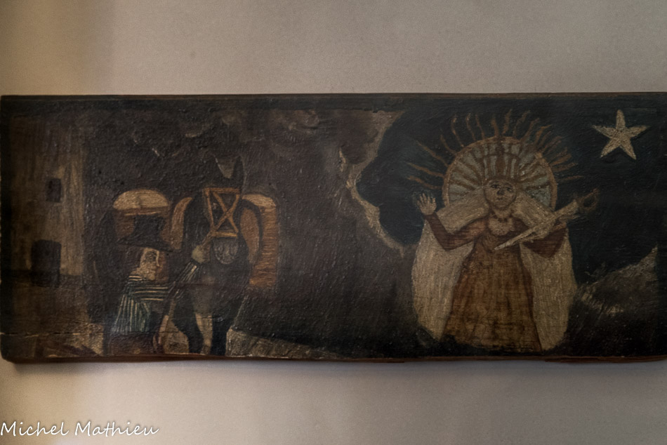 Chapelle Notre-Dame-de-Pitié Homme implorant la Vierge à l’enfant lors du sauvetage d’un vigneron tombé dans une cuve de vin. 1792. Bois. On observe un repentir, le peintre ayant recouvert son tracé et déplacé la figure de la Vierge à droite.