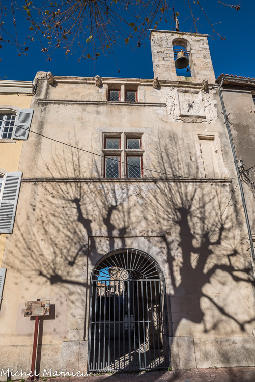 Chapelle Notre-Dame-de-Pitié Le portail date de la reconstruction totale de 1656, édifié en pierre rose de la Couronne selon un dessin du maçon d'Aix Jean Honorat. Baroque, il se compose de pilastres à entablement dorique, fronton brisé à volutes, le tout répété à échelle réduite au-dessus. La niche abritait une Pietà sculptée sous une coquille Saint-Jacques. Un élan vertical guide vers le sommet de la façade percée d'un oculus, autrefois surmonté d'un clocheton à trois pyramides. L'enduit a été refait plusieurs fois, à chaux et sable, du Bolmon pour le plus ancien.