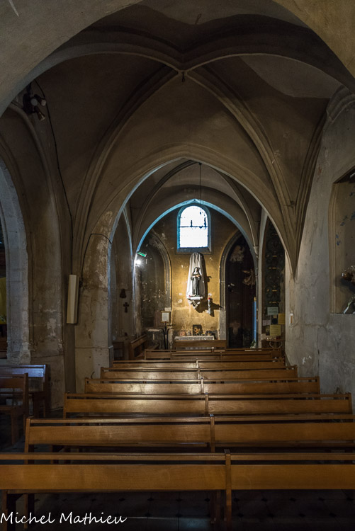 Chapelle Notre-Dame-de-Pitié La nef reprend le modèle des chapelles rurales à trois travées, voûtées d'arêtes séparées par des arcs doubleaux en pierre de la Couronne. Ses dimensions n'ont pas varié depuis l'origine, de même que ses murs blanchis à la chaux et son pavage malloné. Les banquettes datent de 1656, déjà destinées au " confort du public ".Trois fenêtres l'éclairaient au nord. Plusieurs autels la ponctuaient : ceux du Mont Calvaire, de Sainte-Maxime, de Saint-Michel. Un confessionnal coupait la banquette sud, les murs, garnis de lambris depuis 2015, se trouvaient tapissés d'ex-voto.