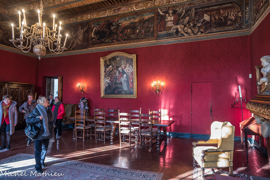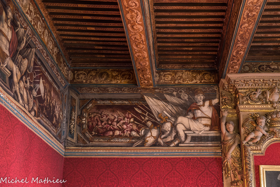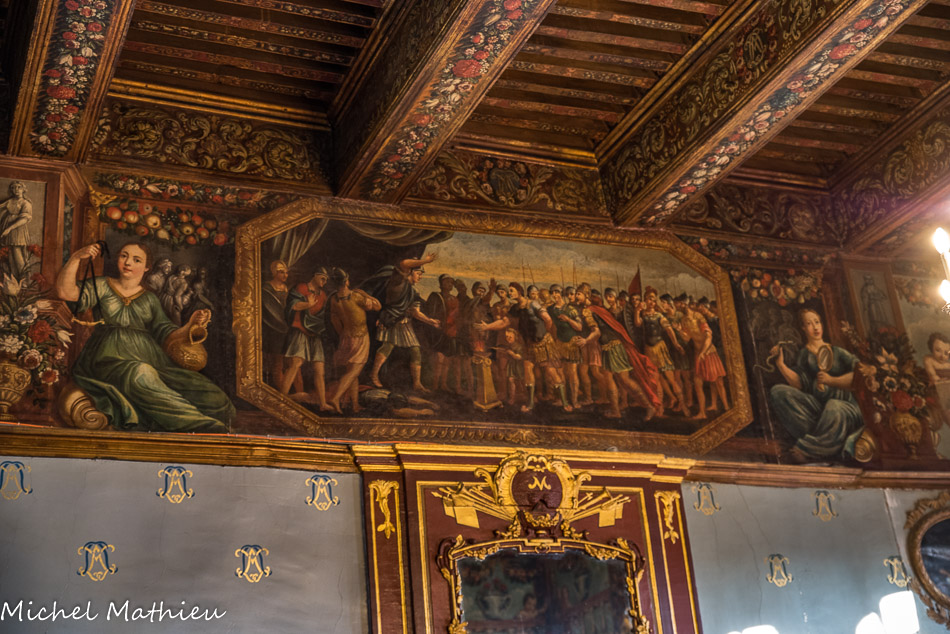 Château des Cauvet Le salon d'apparat décoré vers 1665 offre l'aspect d'une galerie des batailles, sous un plafond à la française orné de guirlandes et médaillons à thème martial. Une longue frise, appelée perspective au XVIIe siècle, couronne les murs, destinés à l'accrochage de tapisseries.