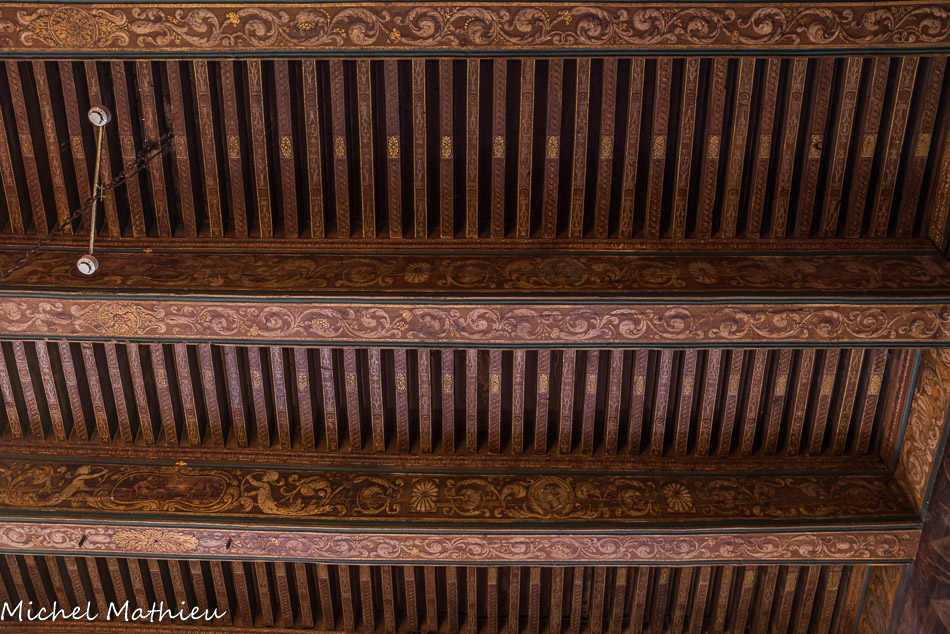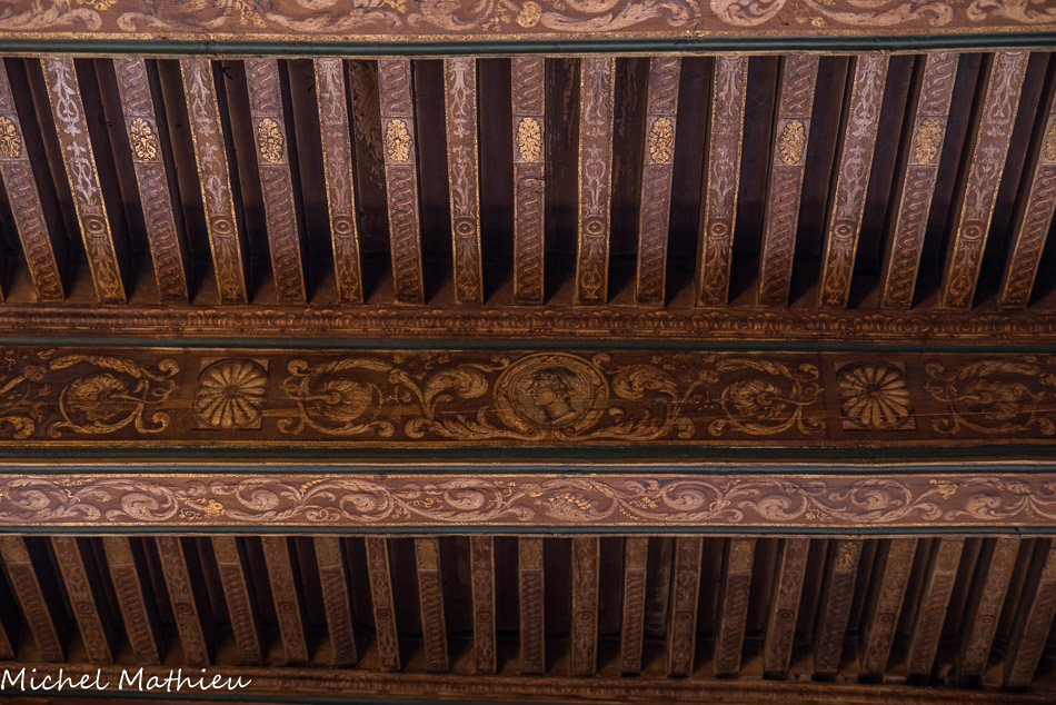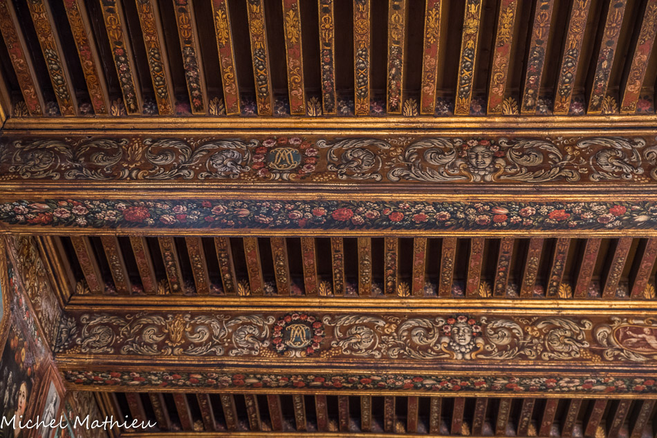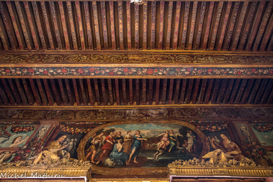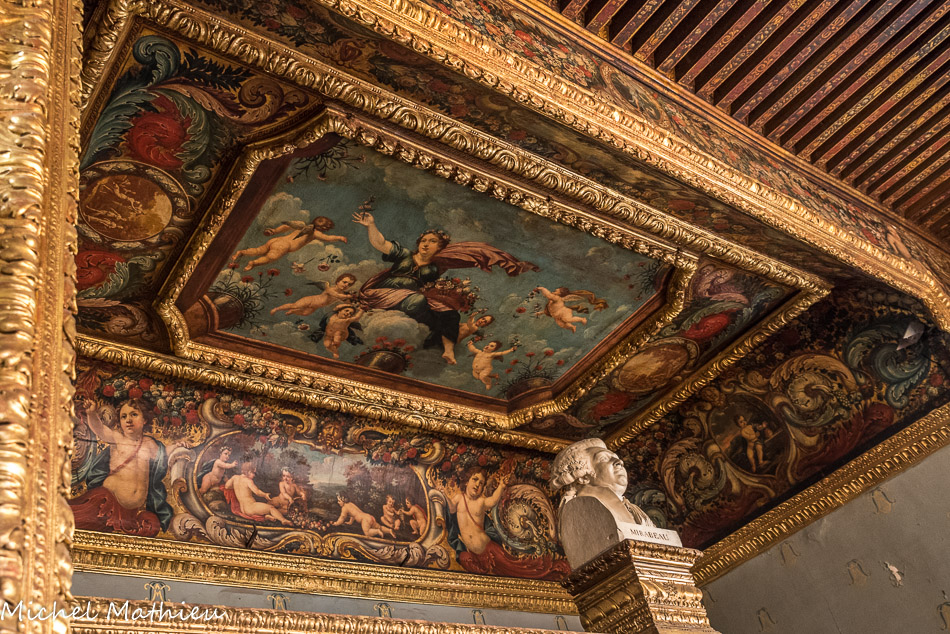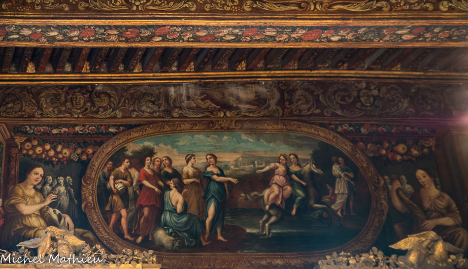 Château des Cauvet Le décor de l'alcôve, archaïque, témoignerait d'une campagne liée au premier mariage de Jean-Baptiste II. Il célèbre l'union fertile sur un plafond à l'italienne : allégorie du printemps, médaillons à l'image des saisons (à gauche, l'été, à droite l'hiver).