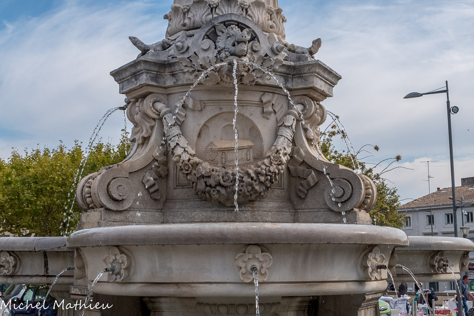 Bourg-Saint-Andéol. Statue Notre-Dame de la Vierne. Cette œuvre est celle de marbriers bourguésans, Bouvas, Pinoti et Imbert, qui s’inspirèrent d’un modèle réduit de Delorme, Grand Prix de Rome. Baussan fils est l'architecte. Les trois faces de la fontaine évoquent la végétation et la faune des Bois du Laoul.