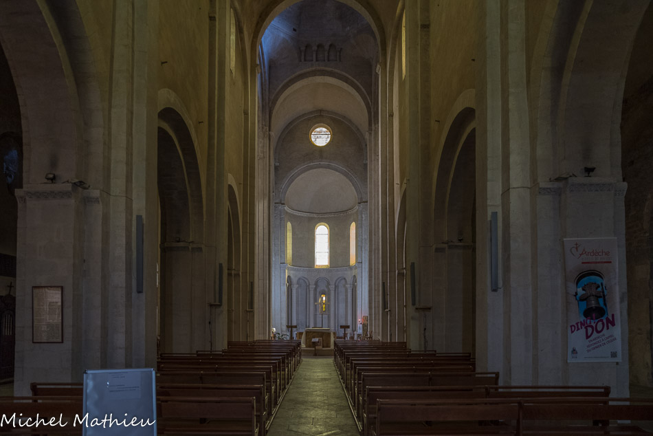 Eglise Saint Andéol. C´est une architecture aux lignes très pures, soulignées par la rareté de la décoration, que nous découvrons en pénétrant dans ce vaste édifice dont les voûtes culminent à près de 17 mètres de hauteur. La lumière dorée qui tombe des vitraux contemporains atténue agréablement la sècheresse de la pierre blanche.