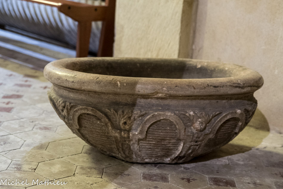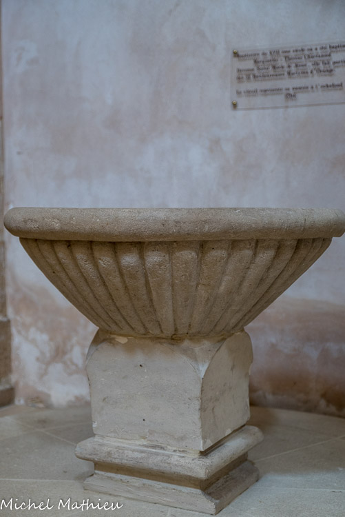 Richerenches. Eglise Saint Denis. Baptistère du XVIIe siècle où a été baptisé Marguerite – Thérèse Charransol, devenue sœur Marie de Jésus, elle fait partie des 32 Bienheureuses martyres d’Orange.