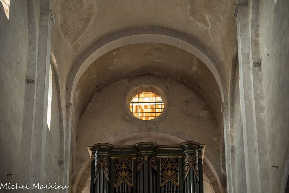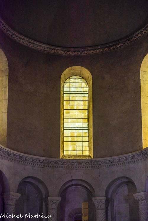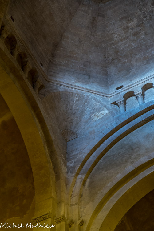 Eglise Saint Andéol. La tour-lanterne octogonale repose sur une souche carrée qui recouvre la coupole de la croisée du transept. La base en est également décorée d’arcatures lombardes. Le premier étage, construit en moyen appareil, avec des pilastres unis aux angles de l’octogone, est simplement ajouré de grandes baies plein-cintre. Mais le deuxième étage a reçu une ornementation beaucoup plus riche. Souligné par un cordon d’oves et de dents d’engrenage, il est flanqué de pilastres cannelés, tandis que ses baies géminées sont richement décorées d’archivoltes très travaillées et de colonnettes aux chapiteaux sculptés, tous différents.