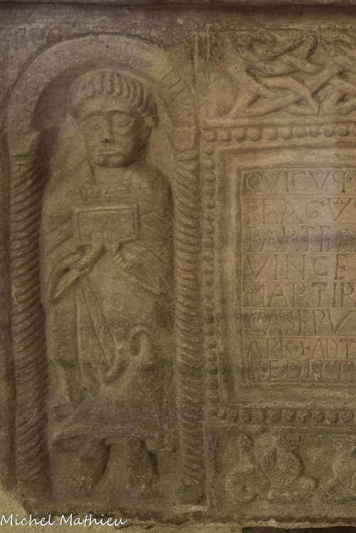 Eglise Saint Andéol. Au centre une longue inscription latine à la gloire du saint et de part et d'autre, deux religieux, saint Polycarpe et saint Bénigne, tenant une tablette entre leurs mains ; ils sont placés sous une arcade en plein cintre à colonnes torsadées à chapiteaux cubiques. Les entrelacs d’inspiration carolingienne occupent la frise supérieure sous laquelle se trouve