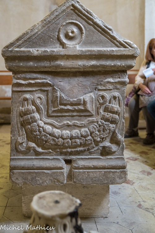Eglise Saint Andéol. Sa quatrième face fut sculptée au début du XIIème siècle. On y retrouve les caractères de la Renaissance de la sculpture romane dans la moyenne vallée du Rhône : l’art des frises, les entrelacs d’inspiration carolingienne, les traditions paléochrétiennes dans les personnages à l’intérieur des niches et enfin l’influence antique (inscription latine).