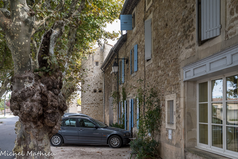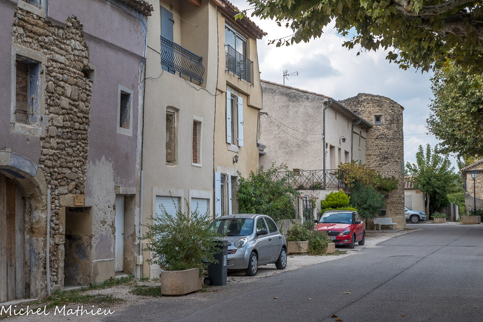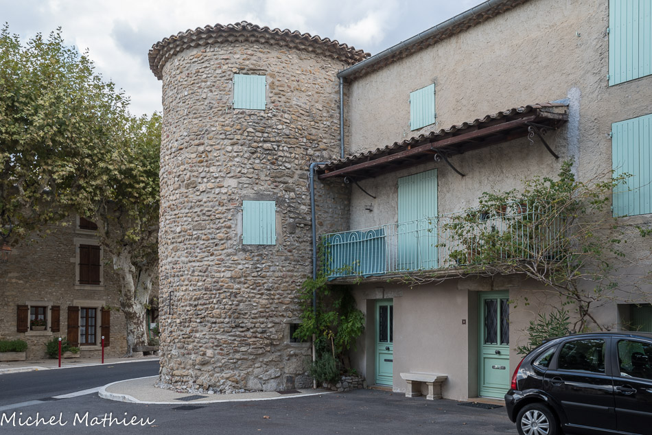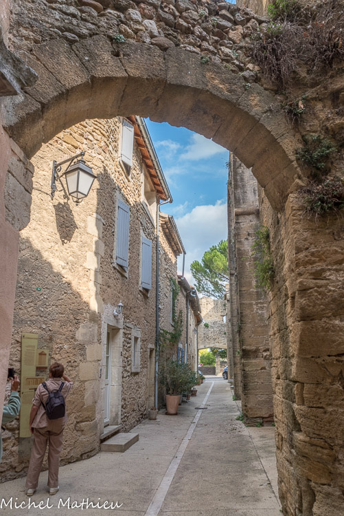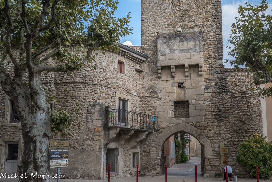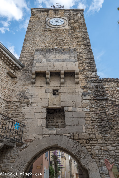 Richerenches. La porte ouest, dont la poret est protége par une bretèche, est surmontée de la Tour de l'Horloge (campanile du XVIIe et porte cloutée).