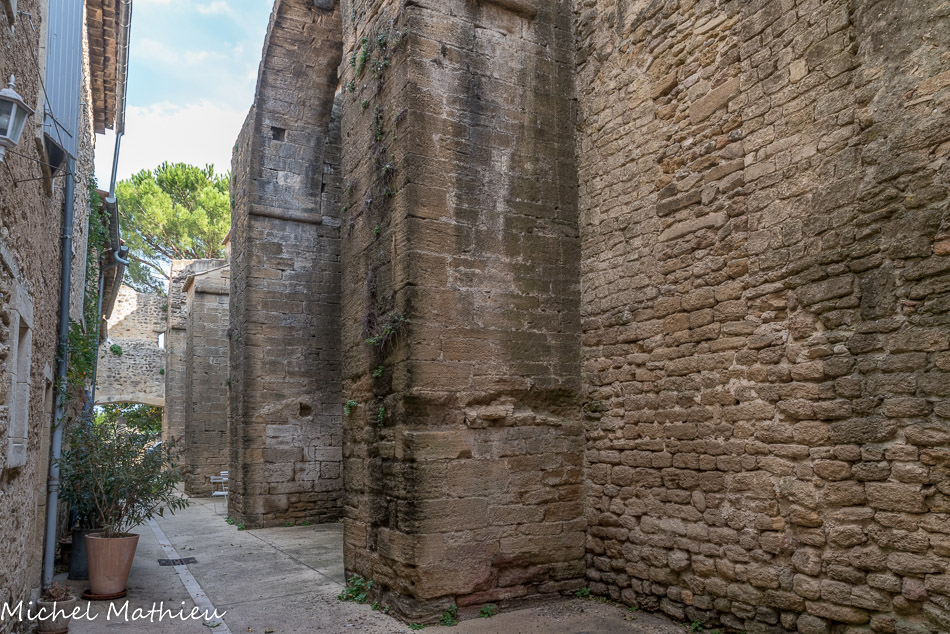 Eglise Saint Andéol. Les façades latérales, très restaurées au xixe siècle, sont contrebutées par des arcs-boutants construits au XVIIe siècle pour consolider l'édifice gravement endommagé au cours des guerres de Religion.