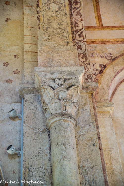 Chapelle des Moines. Berzé. L'arc triomphal retombe sur deux colonnes engagées avec des chapiteaux à feuilles et volutes.