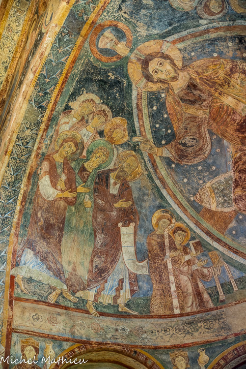 Chapelle des Moines. Berzé. Les apôtres sont répartis en deux groupes de six, de part et d’autre du Christ. En plus petit, sont représentés, à la droite du Christ, les diacres Vincent et Laurent et, à sa gauche deux abbés de Cluny.