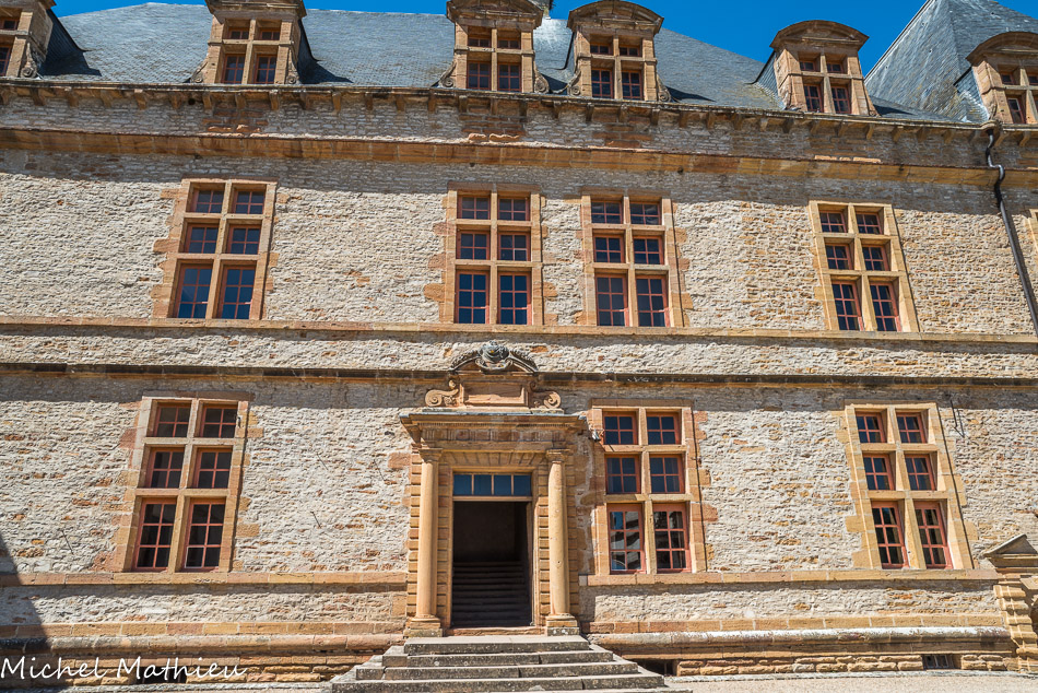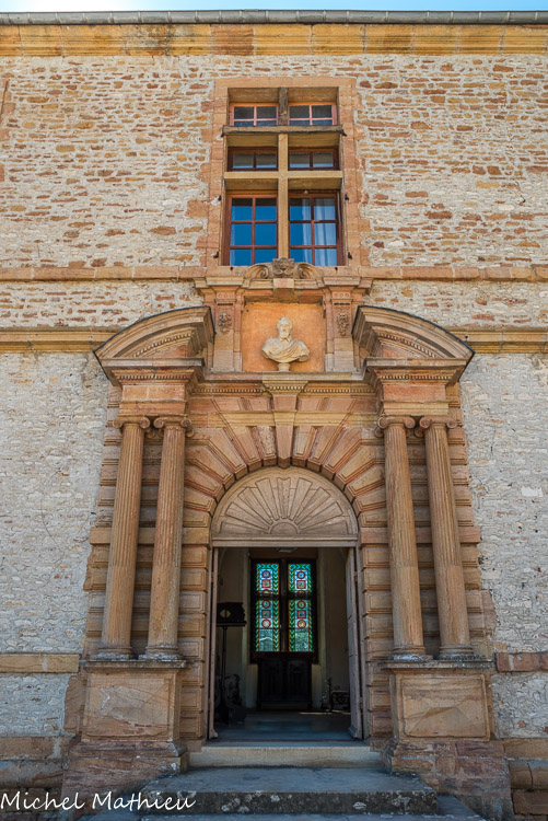 Le château de Cormatin. Toute la richesse architecturale se concentre sur les portes réalisées en 1624. Elles ont probablement été dessinées par Salomon de Brosse, dont on connaît des projets très proches. Le grand architecte avait travaillé pour la reine au palais du Luxembourg jusqu’à 1623. En faisant appel à lui, Jacques du Blé rendait hommage à la souveraine dont il était le protégé. La pierre utilisée vient de la colline d’Ameugny, à 1 km au sud. Elle était apportée par la rivière qui passait encore au pied du château. C’est un calcaire aux grains très fin, coloré par l’oxyde de fer.