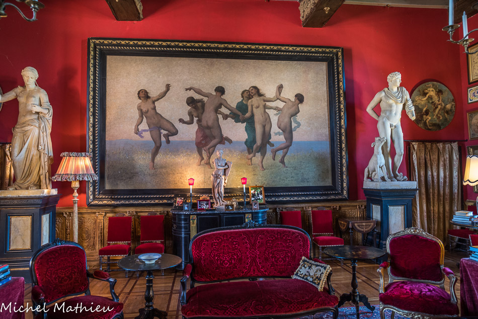 Le château de Cormatin. La bibliothèque 1900. A la fin du XIXe, le propriétaire est Raoul Gunsbourg, directeur de l’Opéra de Monte-Carlo. Il restaure le château en respectant les décors du XVIIe siècle. Cependant, il s’amuse à concevoir lui-même des appartements pour ses invités dans les parties du château qui n’avaient plus de décor. Très éclectique dans ses choix, il crée des ambiances romaines, Louis XIV, Renaissance, gothiques, byzantines, etc. Il n’hésite pas à démembrer des meubles anciens pour composer des cheminées, armoires ou buffets dans le style choisi… Le grand tableau « Ronde antique » de Feyen-Perrin a été exposé au Salon des Beaux-Arts de 1863. Gunsbourg l’a acquis à Paris vers 1910 et Matisse l'aurait vu peu avant, au moment où il élaborait son tableau « La Danse » (1909).
