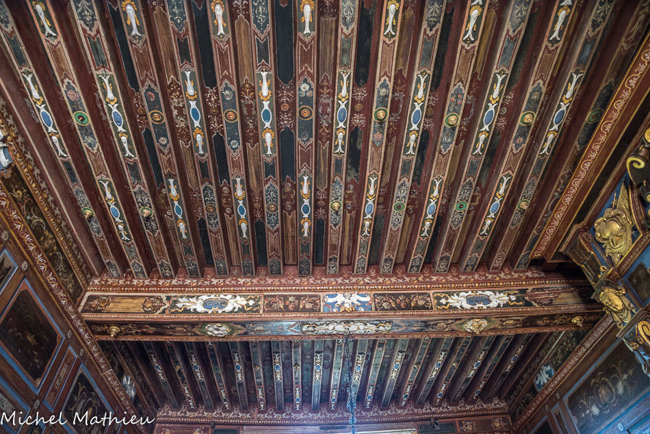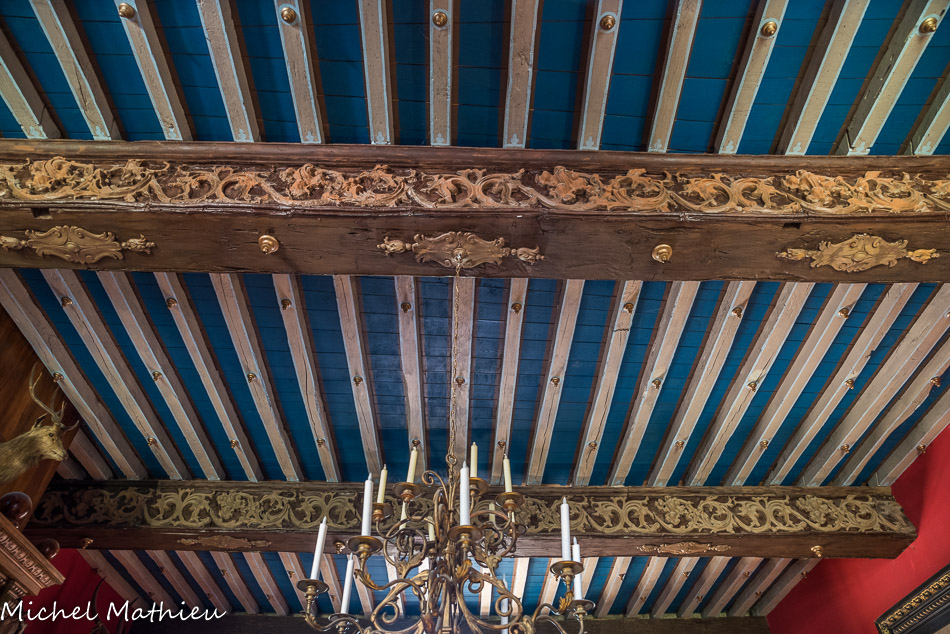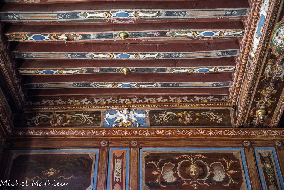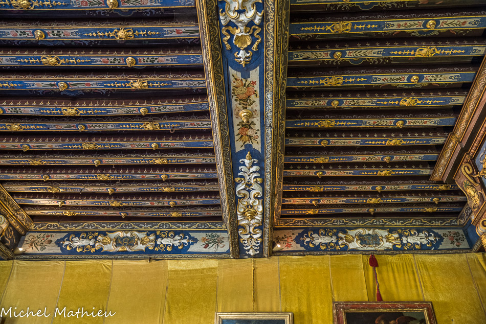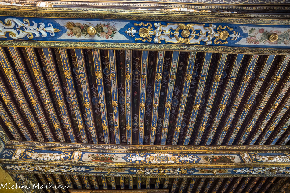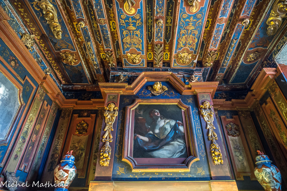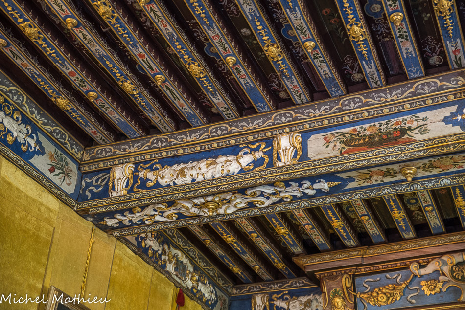 Le château de Cormatin. La chambre de la marquise. Le plafond à la française est somptueux, avec ses poutres peintes en bleu de lapis lazuli, ses ornements en relief blanc et or et ses fleurs assemblées en bouquets et corbeilles
