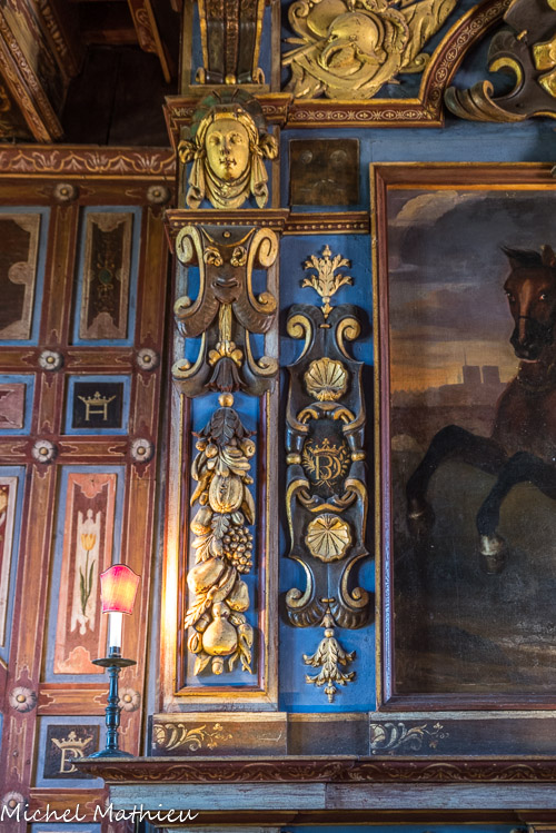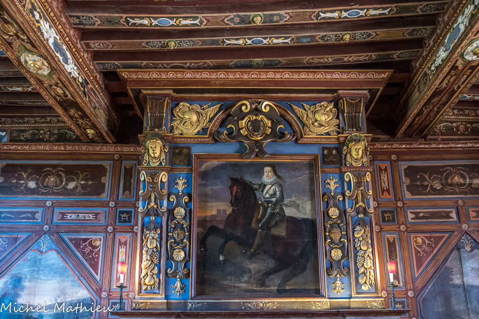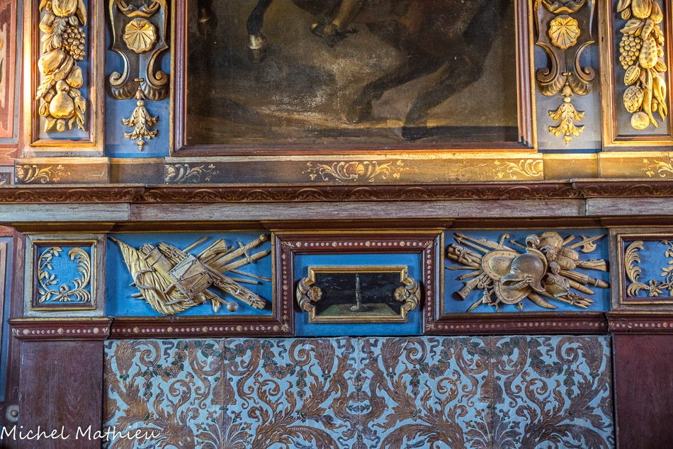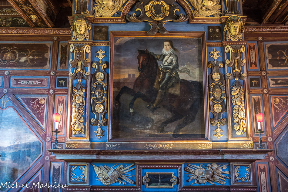 Le château de Cormatin. Au-dessus de la cheminée, dans un encadrement de trophées militaires, le jeune roi Louis XIII caracole devant les tours de Notre-Dame de Paris.