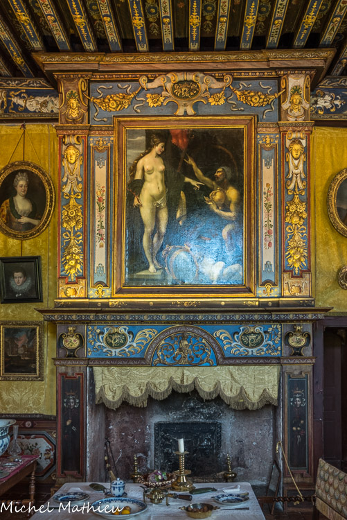Le château de Cormatin. La chambre de la marquise. La cheminée, par son ampleur, évoque les rétables des églises baroques. Elle est ornée d’un tableau «Vénus commandant à Vulcain des armes pour Enée» peint avant 1626 par Quentin Varin, peintre attitré de la reine Marie de Médicis et apporté à Cormatin en avril 1627.
