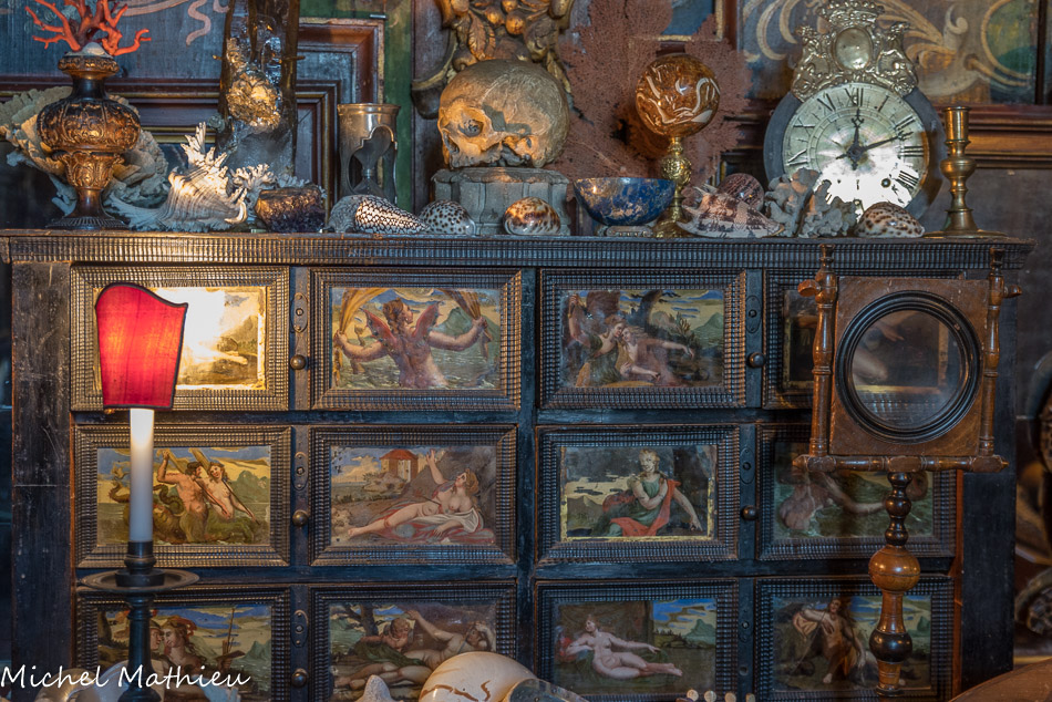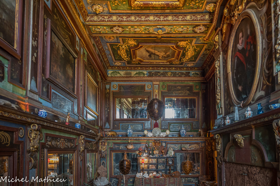 Le château de Cormatin. La salle des miroirs. On y assemblait, sans esprit scientifique mais pour alimenter des réflexions symboliques, objets exotiques ou étranges, coquillages, animaux empaillés, minéraux, bronzes, etc.