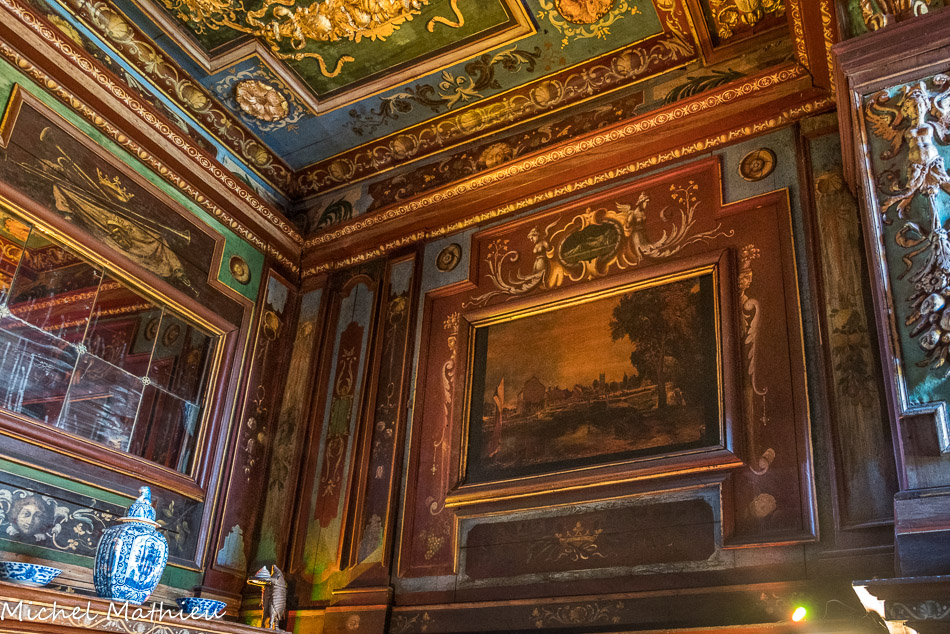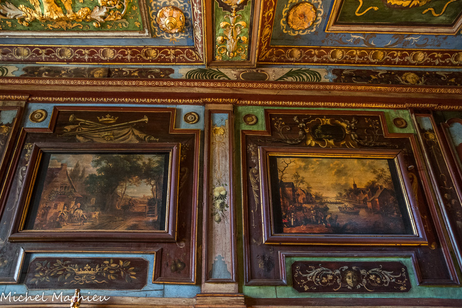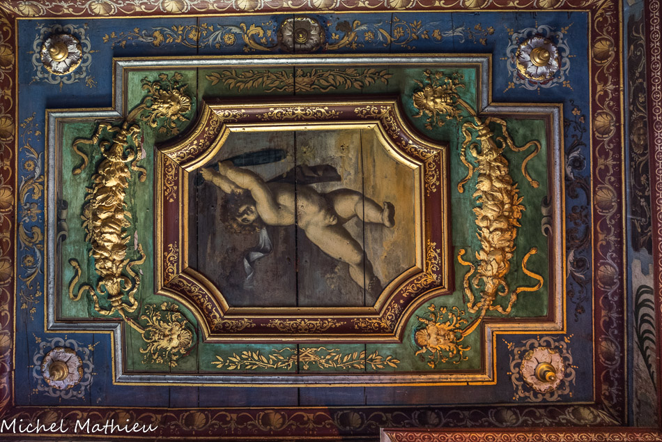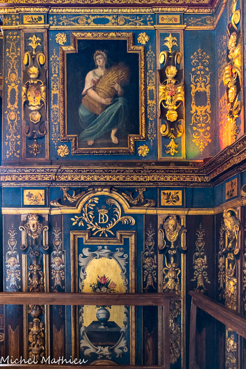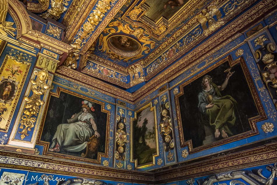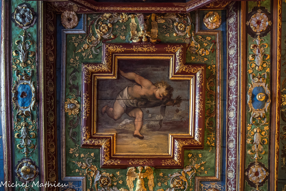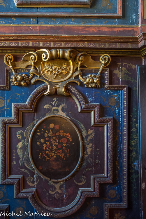 Le château de Cormatin. Le cabinet de Sainte Cécile. Chaque détail est peint avec une grande délicatesse, surtout fleurs et fruits, témoignant de l’origine flamande des peintres, qui ont réalisé ce décor en 1625.