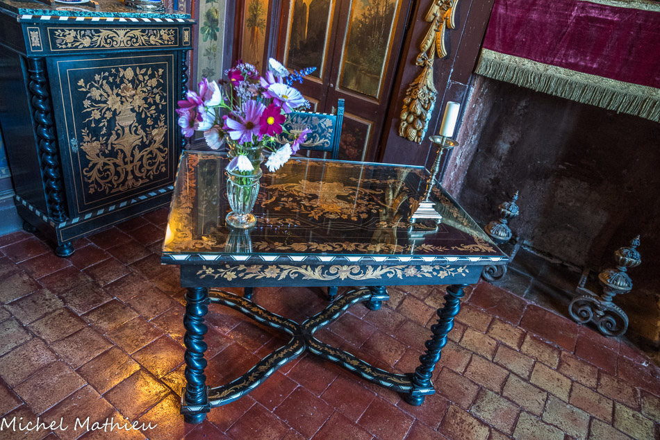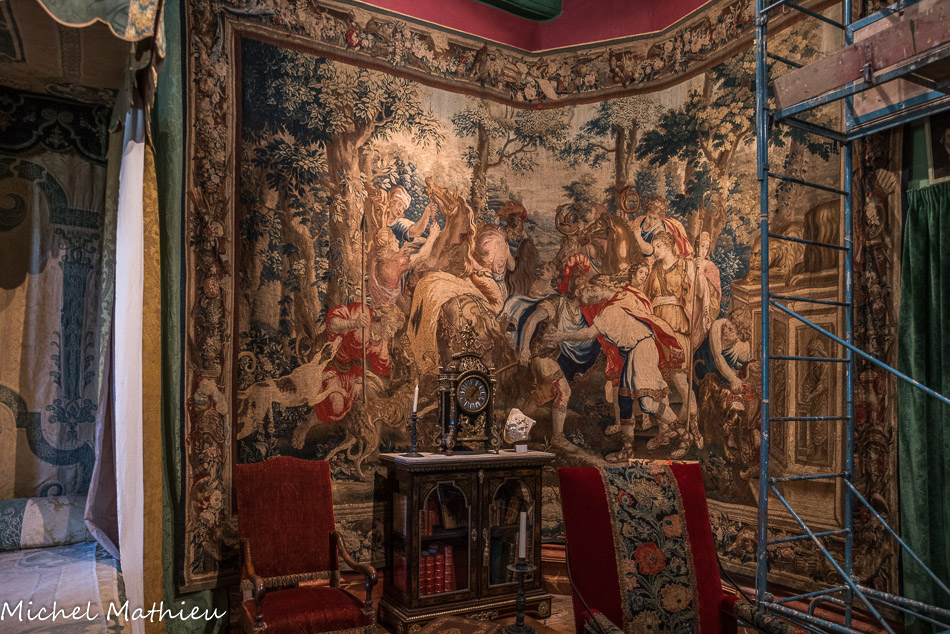 Le château de Cormatin. La chambre du marquis. A l'époque de Jacques du Blé, la pièce était tendue de tapisseries sur le thème des travaux d'Hercules. On peut y voir aujourd'hui une superbe tapisserie de Bruxelles.