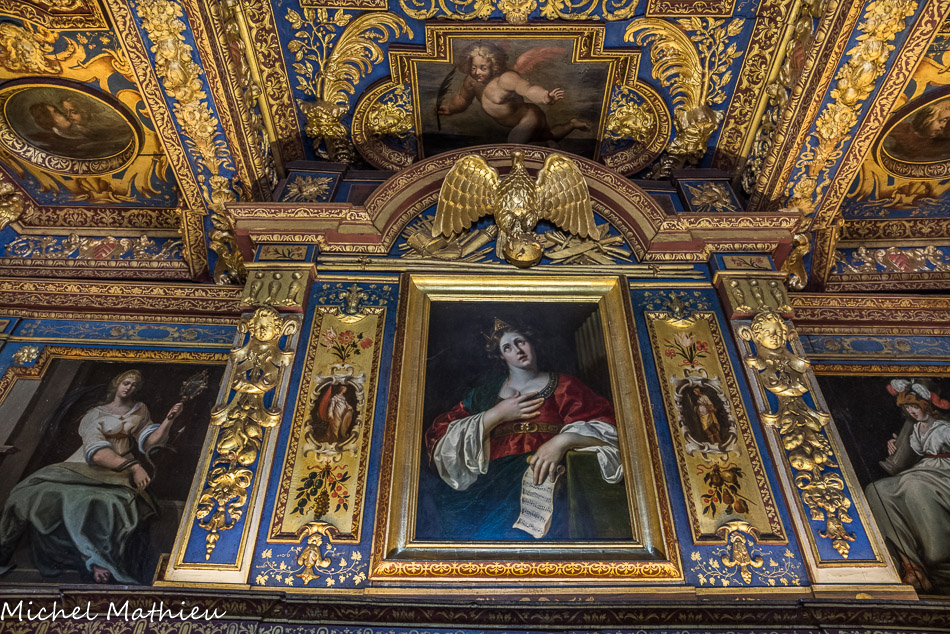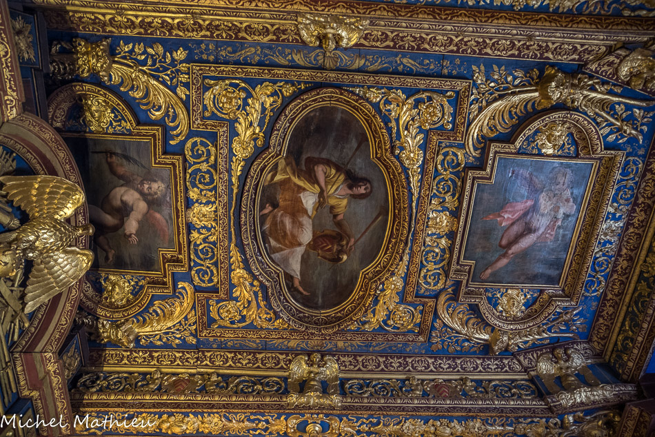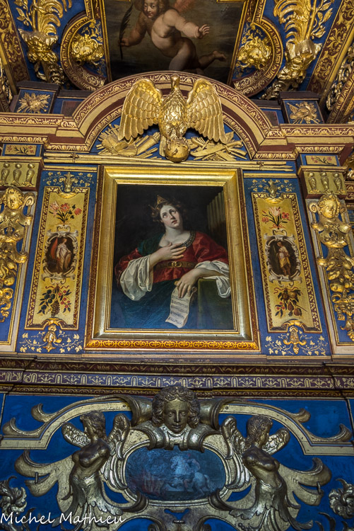 Le château de Cormatin. Le cabinet de Sainte Cécile. La profusion décorative fait naître, « aux lueurs glissantes de l’or, un de ces « enchantements », chers aux Précieux, devant lesquels la raison doit s’avouer vaincue » (A. Mérot).