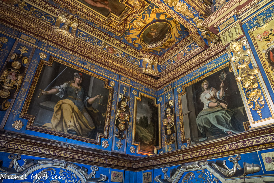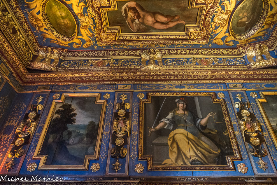 Le château de Cormatin. Le cabinet de Sainte Cécile. Tout autour de la salle, sont représentées les allégories des quatre vertus cardinales. La Justice avec le glaive et la balance.