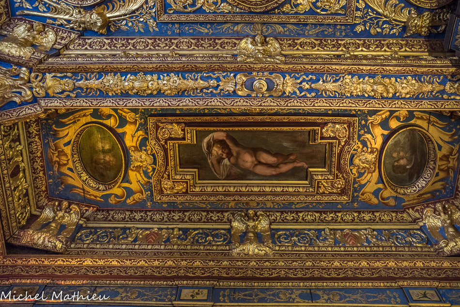 Le château de Cormatin. La salle des miroirs. Le plafond à caissons ornés d’amours volant sur fond de ciel est un des plus anciens témoignages de l’implantation en France de cette mode italienne, apportée au palais du Luxembourg en 1625-26 par Orazio Gentileschi.