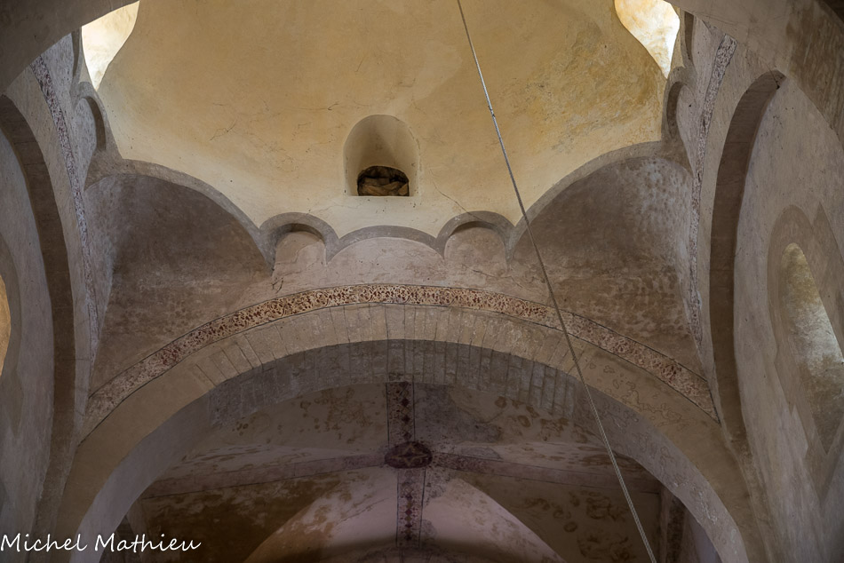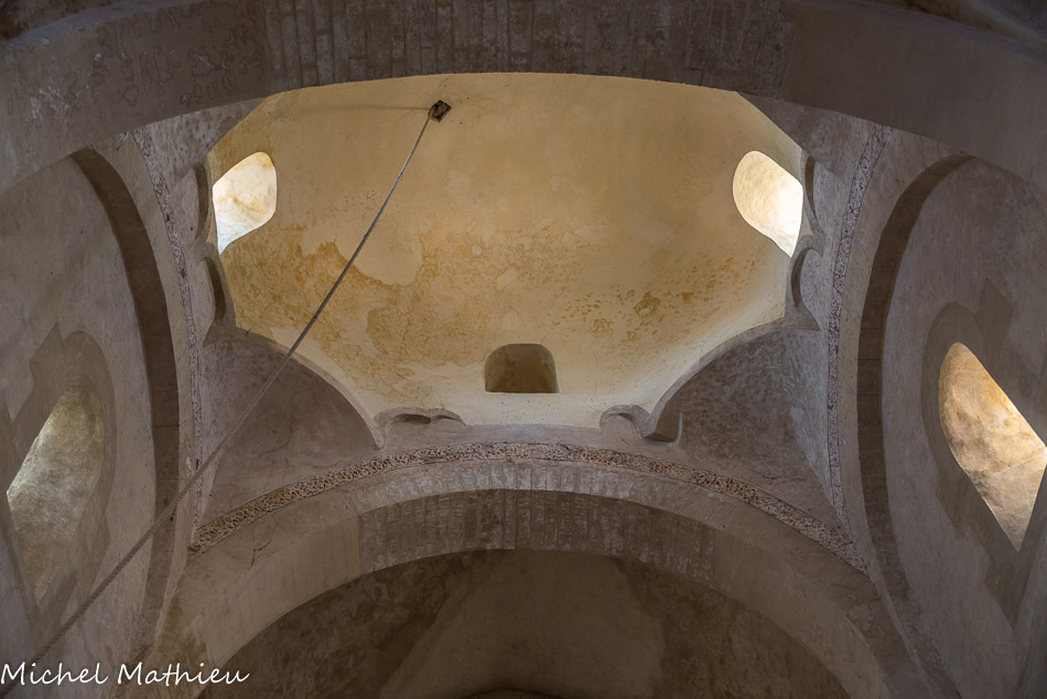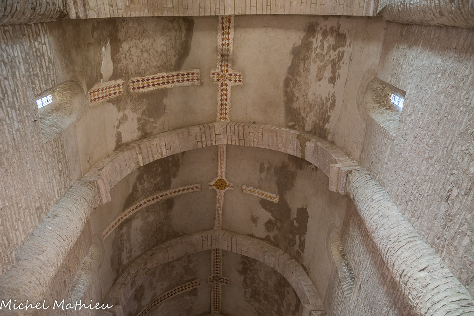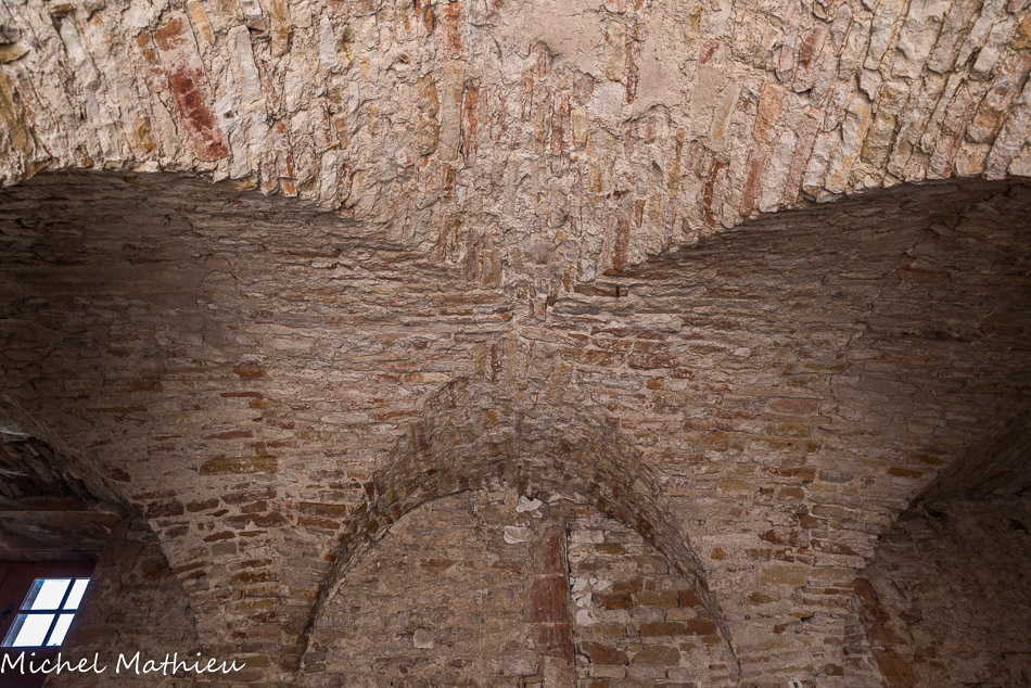 L'église Saint-Martin de Chapaize. Les bas-côtés sont voûtés d’arêtes sur doubleaux reposant sur des pilastres à dosserets des murs gouttereaux. Ils ont été partiellement refaits en moyen appareil aux 12e et 14e siècles, seules les dernières travées du bas-côté sud sont encore entièrement d’origine (ici). Les bas-côtés se prolongent jusqu’aux absidioles, délimitant une croisée singulière voûtée d’une coupole ovoïde sur trompes.