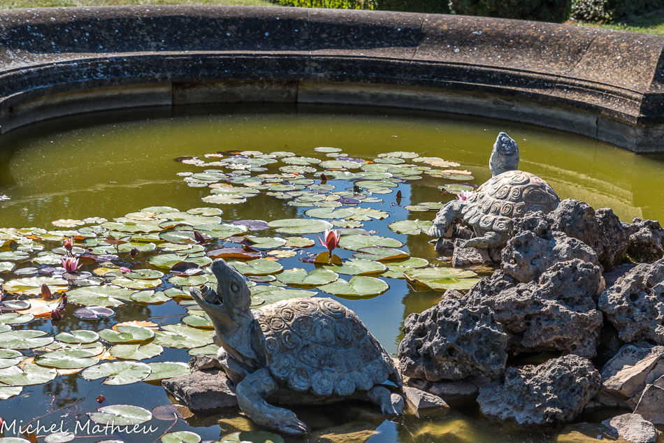Le château de Cormatin. La façade Nord du château. Au centre du parterre, un bassin unit dans sa forme le carré et le cercle. Il offre ainsi l’image de l'union idéale de la Terre et du Ciel, telle qu’elle était réalisée au Paradis terrestre. Au milieu du bassin, l’eau jaillit d’un arbre en fer forgé (l’Arbre de Vie de la Genèse dans la Bible). Quatre tortues.