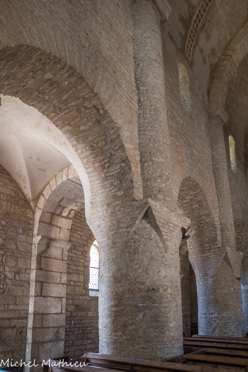 L'église Saint-Martin de Chapaize. Les lourdes arcades et les murs d’un bel appareil dégagé sont supportés par d'énormes piliers ronds aux impostes en forme de triangles renversés qu’on ne retrouve qu’au scriptorium de l'abbaye Saint-Bénigne de Dijon.