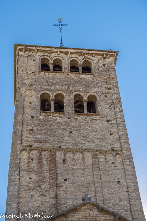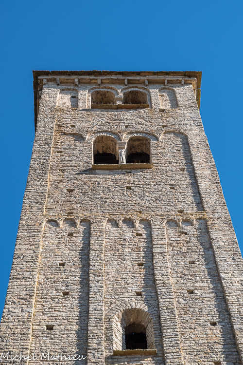 L'église Saint-Martin de Chapaize. Face Ouest. Le clocher central est la merveille de cette église. Ce haut campanile, s’élevant sur 35 mètres, est un chef-d’œuvre de l’art lombard. D’inspiration italienne, c’est le plus beau clocher du début de la période romane en Bourgogne. Il a été construit vers 1040-1050 en petit appareil calcaire. De plan barlong, l’élévation comporte trois étages. Le premier, qui est le plus haut, est décoré de bandes lombardes entourant une baie simple de la coupole intérieure sur chaque face.