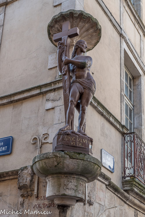 Cette statue était initialement à l'angle de la façade de la maison située au carrefour des rues du Pont & Grand’Rue, d'une part et des rues Saint Vincent& du Châtelet d'autre part. Selon l'inscription du socle, elle date de 1600.C est une copie libre, d'un sculpteur inconnu