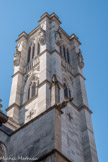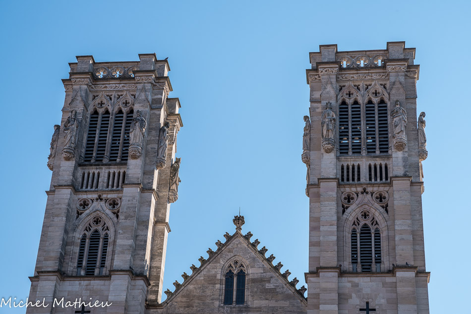 La façade remplace l’ancienne qui était flanquée d’un clocher roman. Les deux clochers actuels sont décorés de statues.