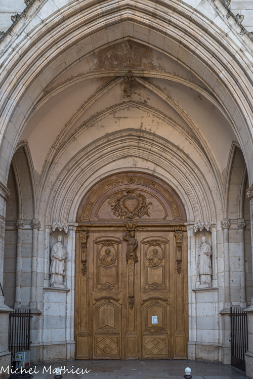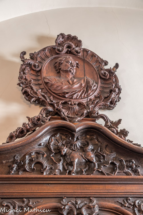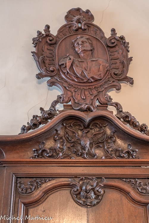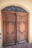 Le grand portail sous le porche de la façade est en bois sculpté.