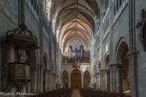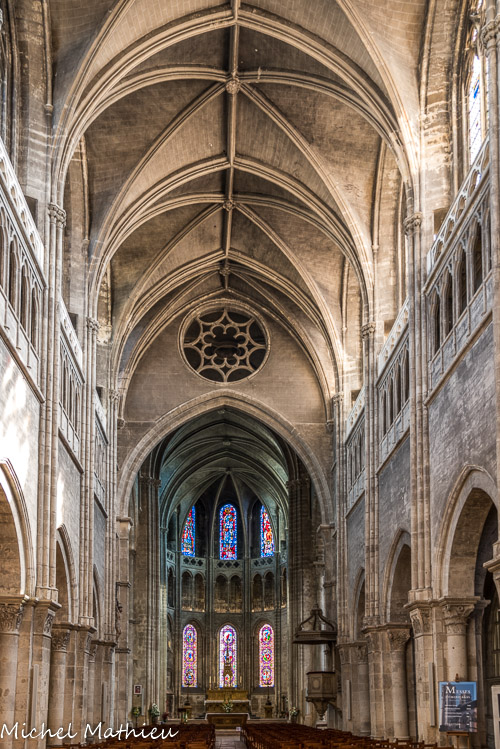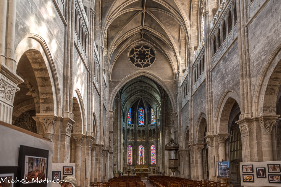 L’histoire de la construction est complexe et s’étale sur plusieurs phases distinctes menant de 1090 aux années 1520. La partie romane, elle-même composée de trois phases, comprend les absidioles des années 1090, les parties basses du chœur et du transept des années 1120-1130 et les bas-côtés et parties basses de la nef du milieu du 12e siècle. La nef de sept travées s’élève sur trois étages dont le premier est du milieu du 12e siècle. Les grandes arcades brisées à doubles rouleaux surmontent des piliers cruciformes cantonnés de deux colonnes engagées et de deux pilastres cannelées. Les étages supérieurs de la nef présentent un triforium à balustrade ajourée et des fenêtres hautes dans le style gothique du 14e siècle. Une curiosité architecturale : une grande rose intérieure. Gothique, elle est percée au-dessus de l'arc roman, qui sépare la nef centrale du transept (c'est un vestige du temps où la nef, encore romane, couverte d'un plafond plat, était plus basse que le transept).