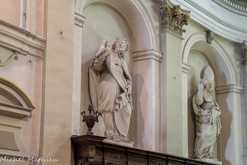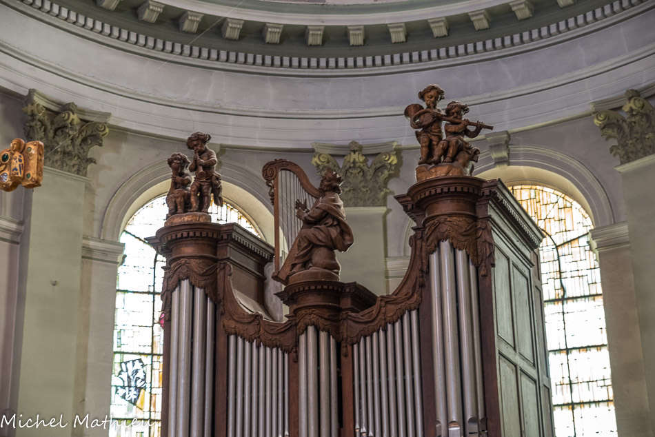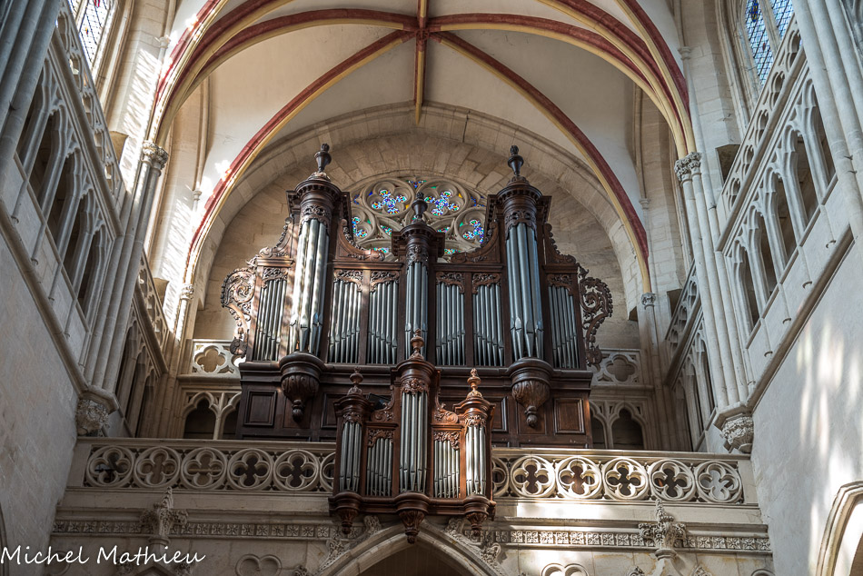 La tribune supportant le buffet d’orgue est du 18e siècle. L'orgue de tribune date de la fin du XVIIe siècle. Le buffet est classé au titre des monuments historiques en 1846, alors que la partie instrumentale est inscrite à titre objet en 1972. Le grand orgue initial subsista jusqu'en 1751. À cette date, on fit appel à Karl-Joseph Riepp (1710-1775), facteur d'orgues, qui construisit l'instrument actuel, initialement à quatre claviers et quarante-quatre jeux (réduit à trois claviers vers 1850).