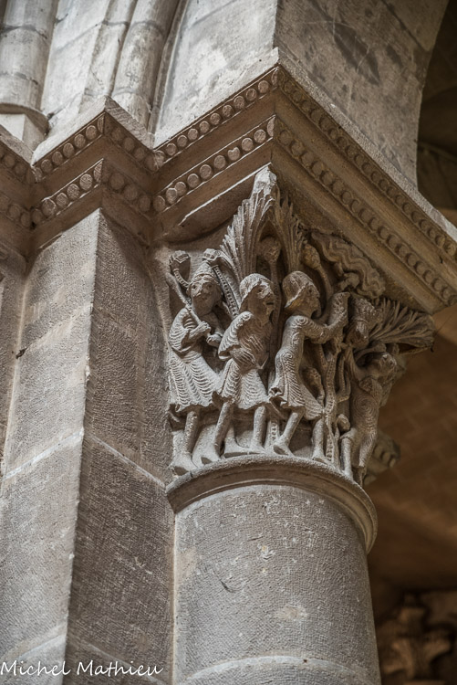 Chapiteau de la nef : Caïn et Abel. Les chapiteaux en haut relief surmontent les colonnes engagées des piliers de la nef et du chœur. Généralement datés de 1120 à 1150, les chapiteaux du chœur sont plus anciens que ceux de la nef.