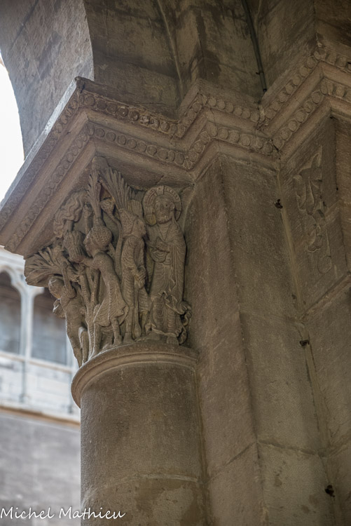Dans le bas-côté nord de la nef, le chapiteau de l’Enlèvement d’Alexandre montrant un épisode de la légende d’Alexandre le Grand, sans doute un réemploi du 11e siècle, se trouve au revers de la façade.