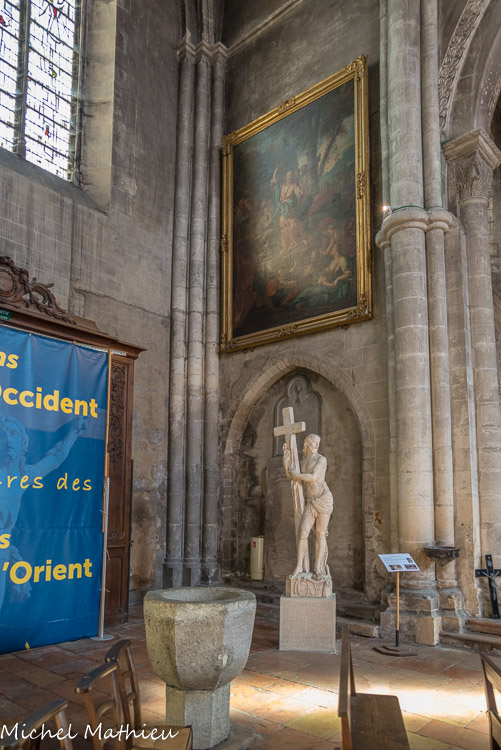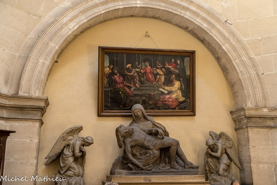 Dans la Chapelle Notre-Dame-de-Pitié, dans le croisillon sud, la grande tapisserie eucharistique date de 1510. Cette tapisserie, de facture flamande, était destinée à orner la façade de la maison des donateurs, la famille Baichet, qui habitait l’actuelle maison des 4 saisons rue du Châtelet. La devise de la famille, Spes mea Deus, est répétée dans les médaillons.