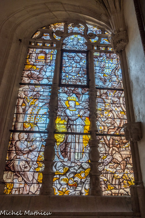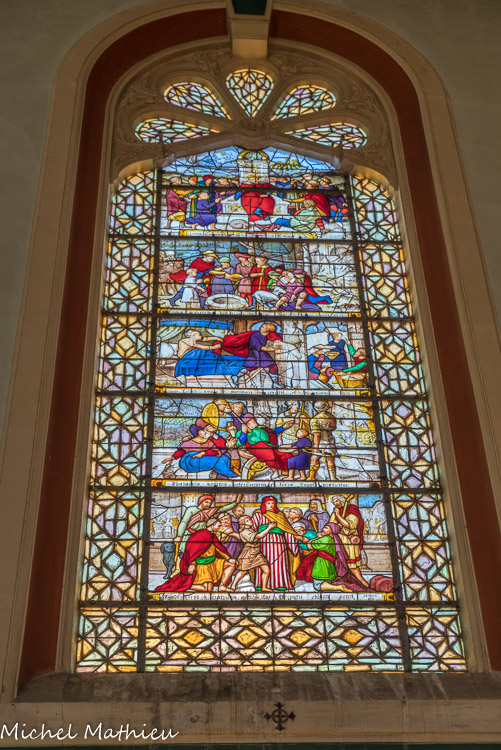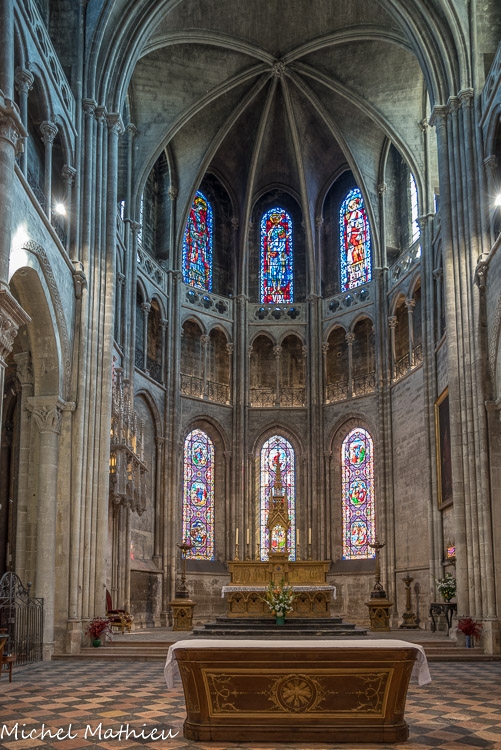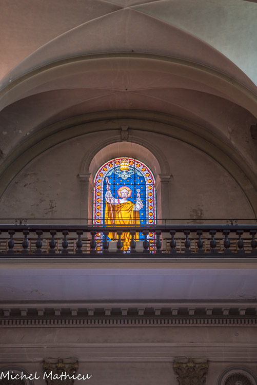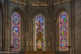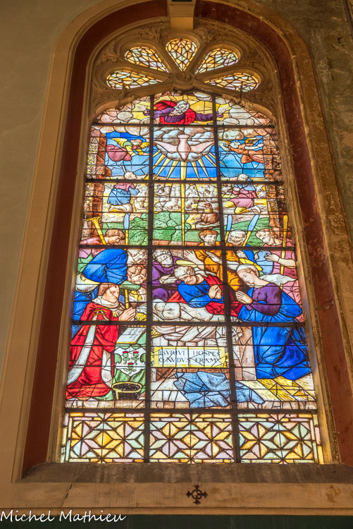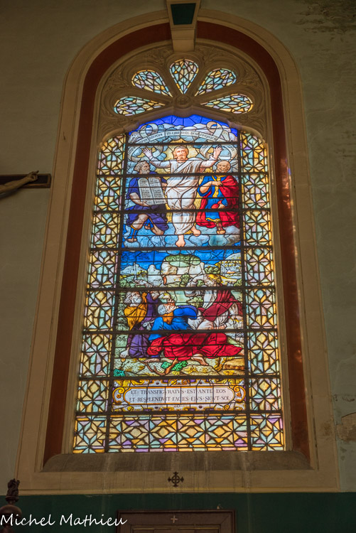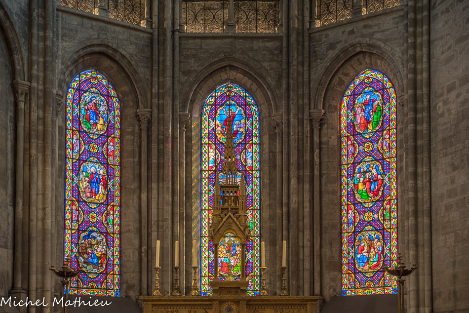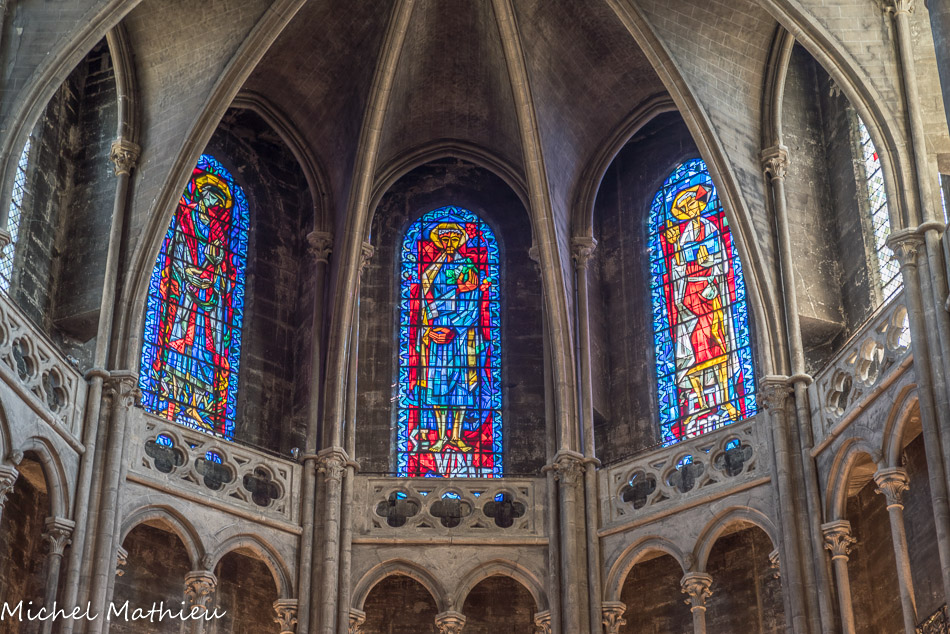 En ce qui concerne la deuxième galerie, au niveau du chœur, elle fut originairement sans balustrade, mais au cours du XIVe siècle elle se voit rajouter sur son côté sud une balustrade ajourée de quatre-feuilles. Au centre, st Vincent, à droite st Etienne. Ces vitraux modernes (1954) qui, par le haut, inondent l'édifice de leur lumière, sont l'œuvre de Pierre Choutet.