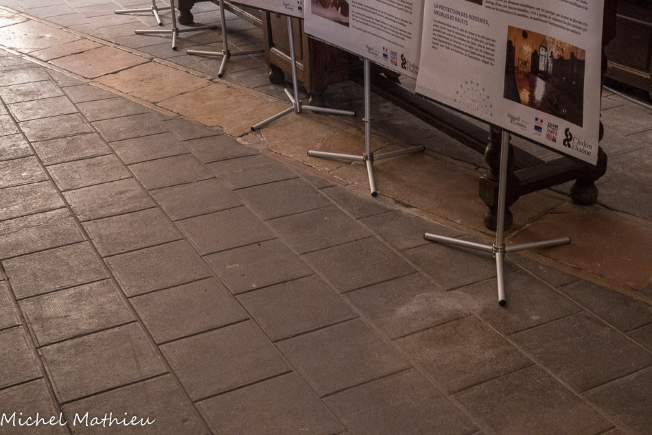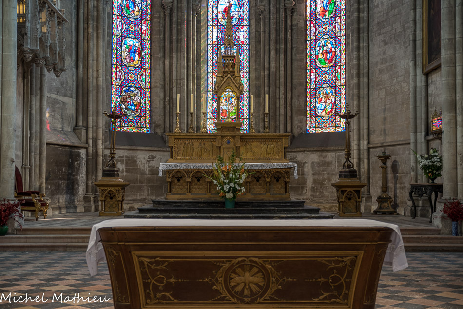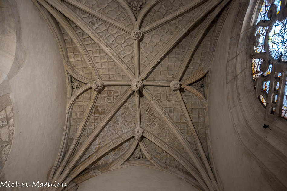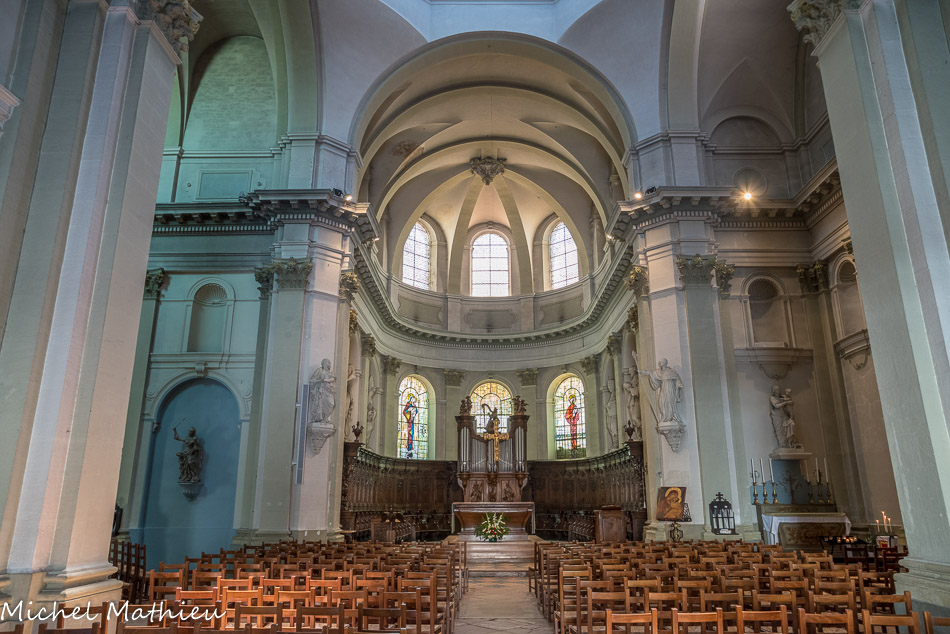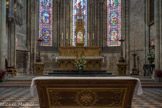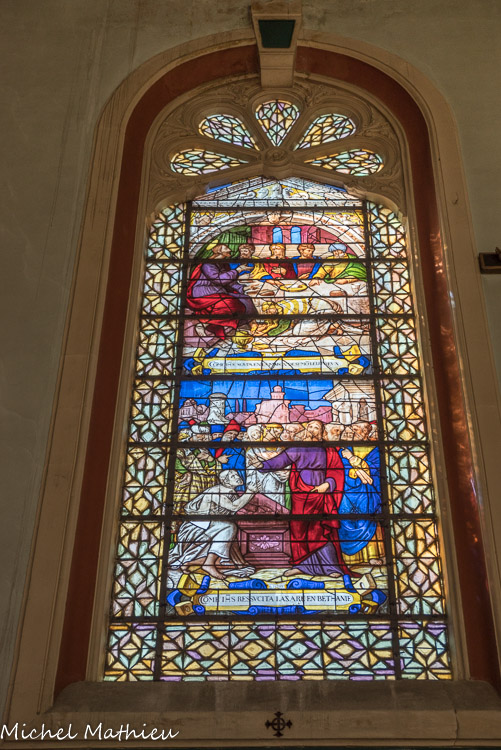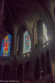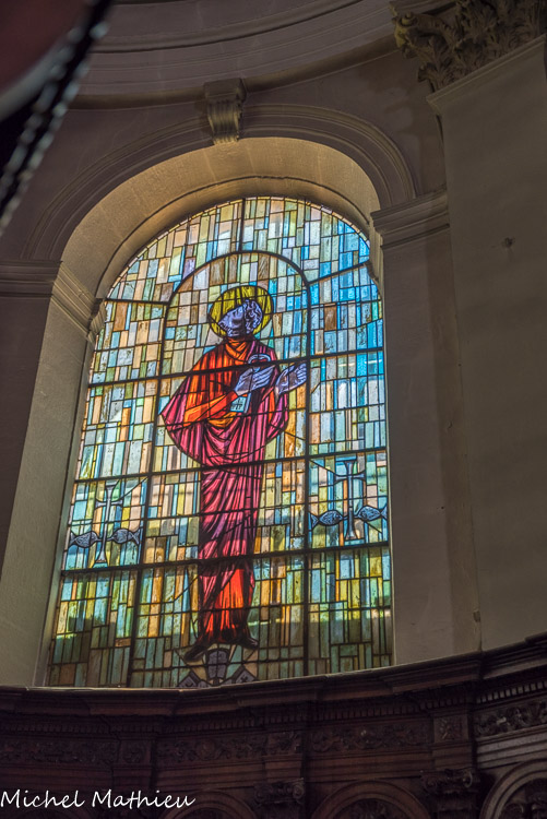 En ce qui concerne la deuxième galerie, au niveau du chœur, elle fut originairement sans balustrade, mais au cours du XIVe siècle elle se voit rajouter sur son côté sud une balustrade ajourée de quatre-feuilles. Au centre, st Vincent, à droite st Etienne. Ces vitraux modernes (1954) qui, par le haut, inondent l'édifice de leur lumière, sont l'œuvre de Pierre Choutet.