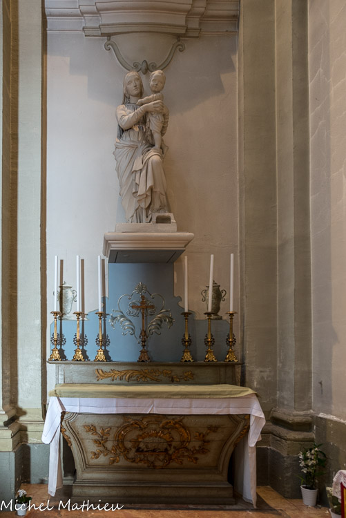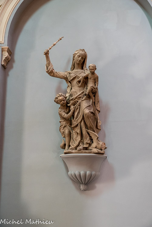 Copie de la statue qui se trouve dans la Cathédrale St-Vincent , en bois, et qui se trouvait ici. C'est monsieur Gaillard qui réalisa le travail, dans un tronc d'orme.