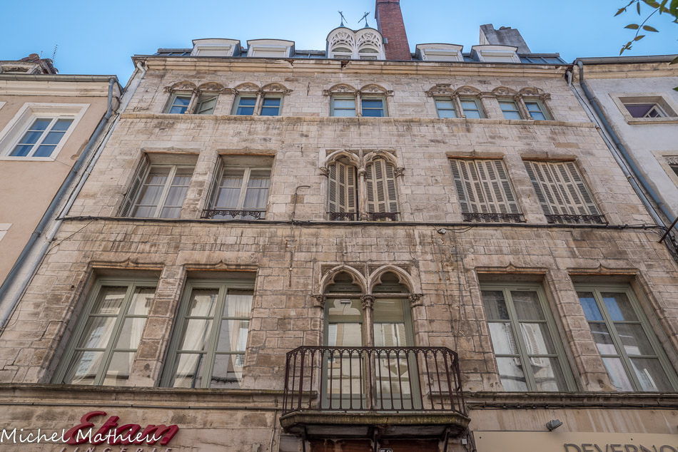 Côté rue, sa façade de pierre est composée de deux arcades à usage commerçant au rez-de-chaussée, de deux niveaux de logements au-dessus percés de fenêtres et surmontés de toits ornés de lucarnes. Si les fenêtres du 1er étage sont décorées de linteaux accolade, encore d'esprit gothique, les linteaux sont droits au deuxième étage; de même, les ouvertures ne sont pas encore rigoureusement symétriques comme au siècle suivant. Afin de desservir les étages, deux escaliers à vis, situés dans des tourelles (visibles depuis la rue) étaient reliés, à la façade sur cour, munie de galeries de circulation gui bois» Ce type de distribution permettait le partage de telles maisons; il y eut d'ailleurs ici deux propriétaires de 1553 à 1735.