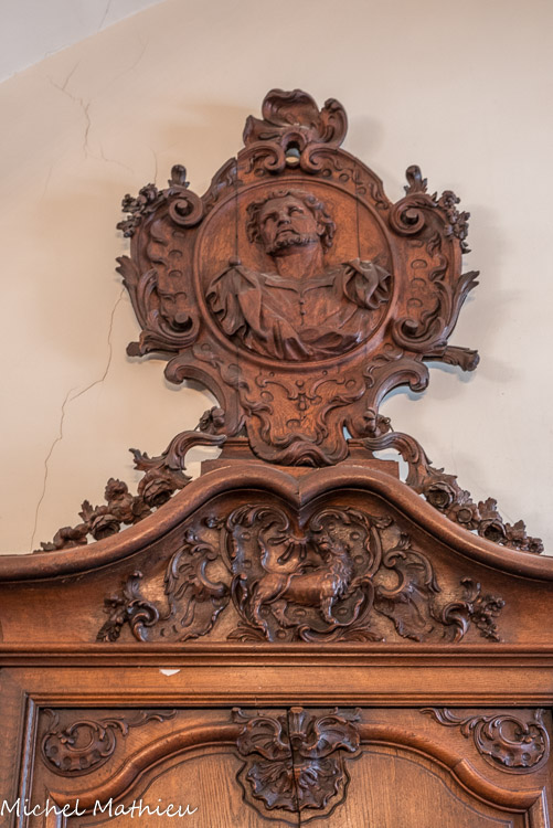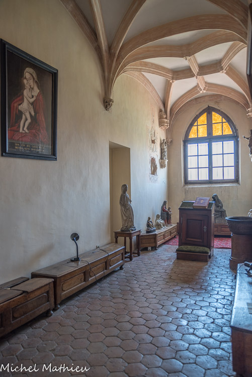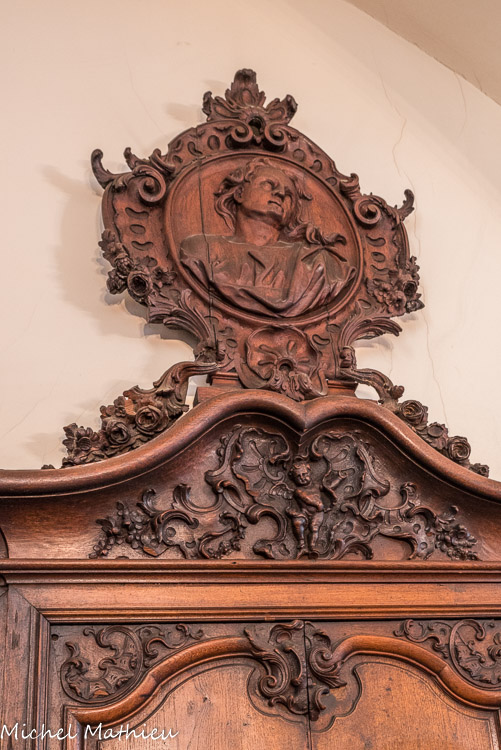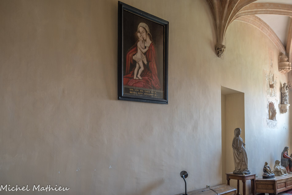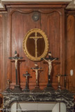 La chapelle a recueilli des œuvres d'art provenant des parties démolies : boiseries armoriées