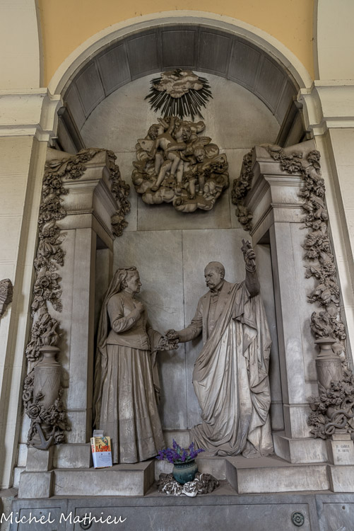 Cimetière monumental de Staglieno. Sculpteur D. Carli, 1892. De ces vieux couples respectables, un beau groupe de la galerie frontale nous offre une illustration sur le thème des retrouvailles dans l’au-delà : statufiés en pied, sortant dirait-on chacun d’une porte, mari et femme se rencontrent cérémonieusement, l’épouse porteuse de son voile de veuve, une main sur le cœur, l’autre placée dans celle du mari, avec lequel elle semble échanger un bouquet de fleurs. L’attitude de l’homme est plus théâtrale, qui brandit de la main gauche un crucifix en guise de bienvenue : le thème des retrouvailles individuelles s’inscrit ici sans heurt dans une atmosphère de religiosité traditionnelle.