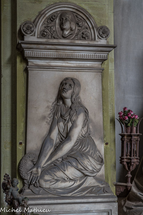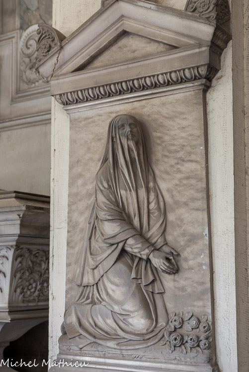 Cimetière monumental de Staglieno. Tombe de Luigi Priario, sculpteur Demetrio Paernio, 1881. Au pied de l’orateur, c’est bien l’épouse dans ses atours aux dentelles minutieusement ciselées qui exprime sa douleur, comme le précise l’épitaphe.