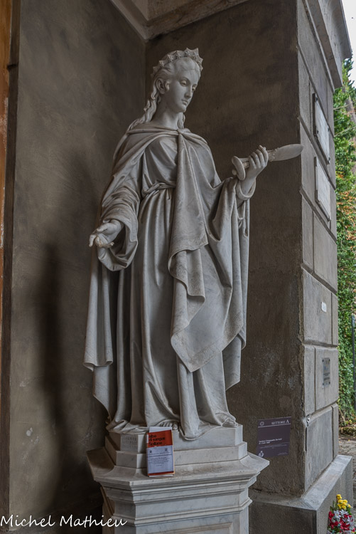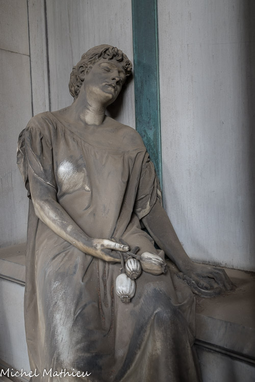 Cimetière monumental de Staglieno. Tombe Erba, 1883, sculpteur Santo Saccomanno. La tombe de Carlo Erba, commerçant et politicien affirmé, a été commandée par un parent. Ce monument présente les formes d’une cathédrale néogothique ; à l’intérieur, sur le sarcophage, estnassise une femme avec des graines de pavot, un symbole païen de l’oubli éternel, entre les doigts de sa main droite, abandonnée sur son giron. Sa veste qui glisse le long de son bras découvre son épaule, lui conférant ainsi un brin de sensualité insolite pour l’époque, qui a donné lieu à beaucoup de polémiques. Cette personnification du Sommeil Éternel transpose l’image de la mort dans une dimension pré-symboliste, voire laïque, malgré la présence d’une grande croix au fond, et elle met en évidence sa partie liée au mystère et au vide.
