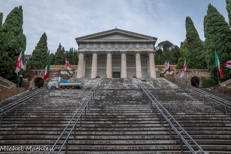 Cimetière monumental de Staglieno. Le panthéon de style romain avec son très beau pronaos de colonnes en style dorique, flanqué de deux statues de marbre représentant les prophètes bibliques Job et Jérémie.
