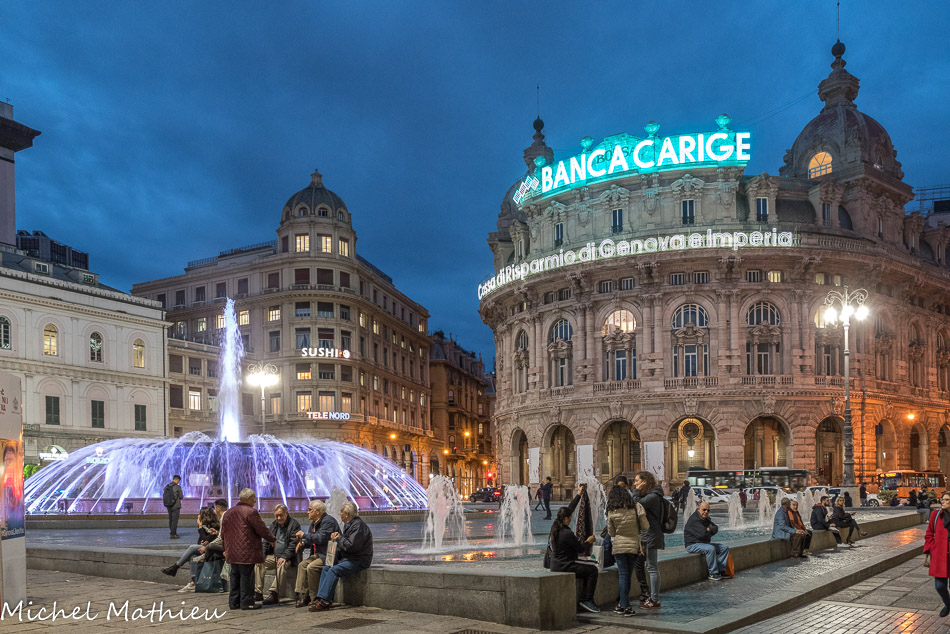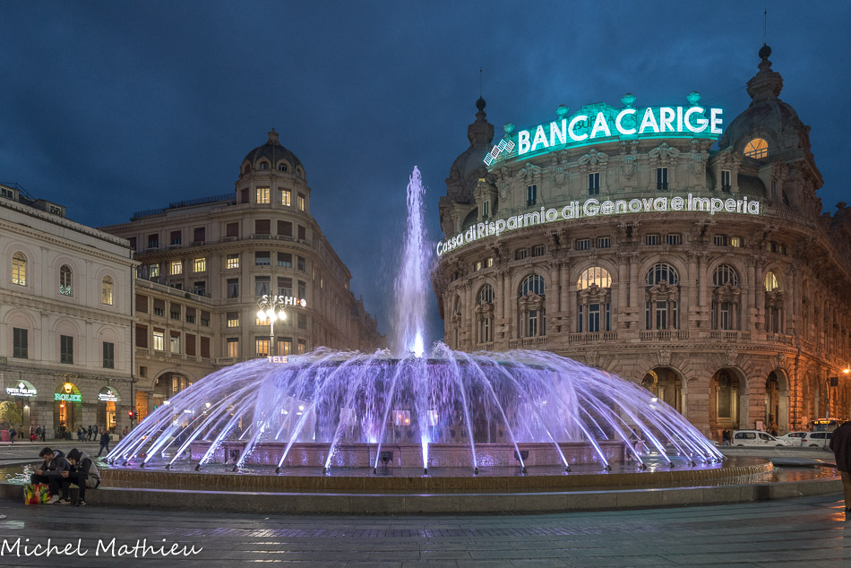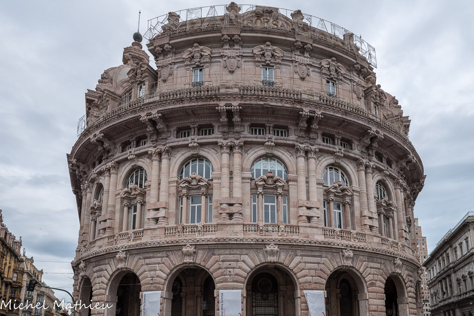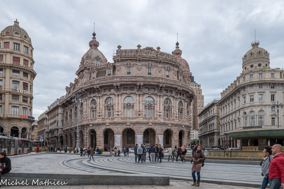 À la fin du 19e siècle, Gênes fut le principal centre financier de l’Italie avec Milan et la Piazza De Ferrari était l’endroit où de nombreuses institutions ont été créées, comme la bourse, le Credito Italiano, les succursales de la Banque de l’Italie. Le bâtiment de la Bourse, construit en 1912 par l'architecte Alfredo Coppedè. A droite, Le palais du Duc de Galliera, Raffaele De Ferrari.